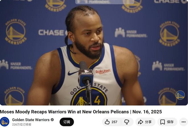 在穆迪率领下,勇士队全场命中创赛季单场新高的24记三分,共有11人投进三分,其中库里仅命中1记,并且6中1的效率全队最差。
