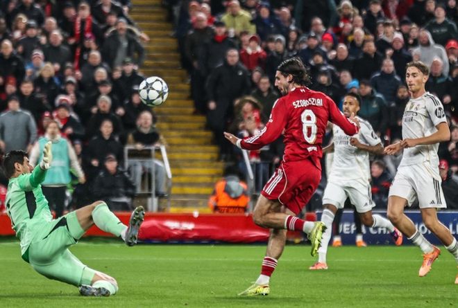 第28分钟,利物浦踢出犀利的反击。维尔茨在右侧送出横传,索博斯洛伊包抄射门,结果皮球被库尔图瓦用脚挡出。利物浦浪费了上半场最好的一次机会。5分钟后,楚阿梅尼手球,裁判判罚任意球。但是,在VAR的介入下,他看了回放,认定没有犯规,取消之前的判罚。第43分钟,索博斯洛伊远射被扑了出去。半场结束,比分依然是0-0!